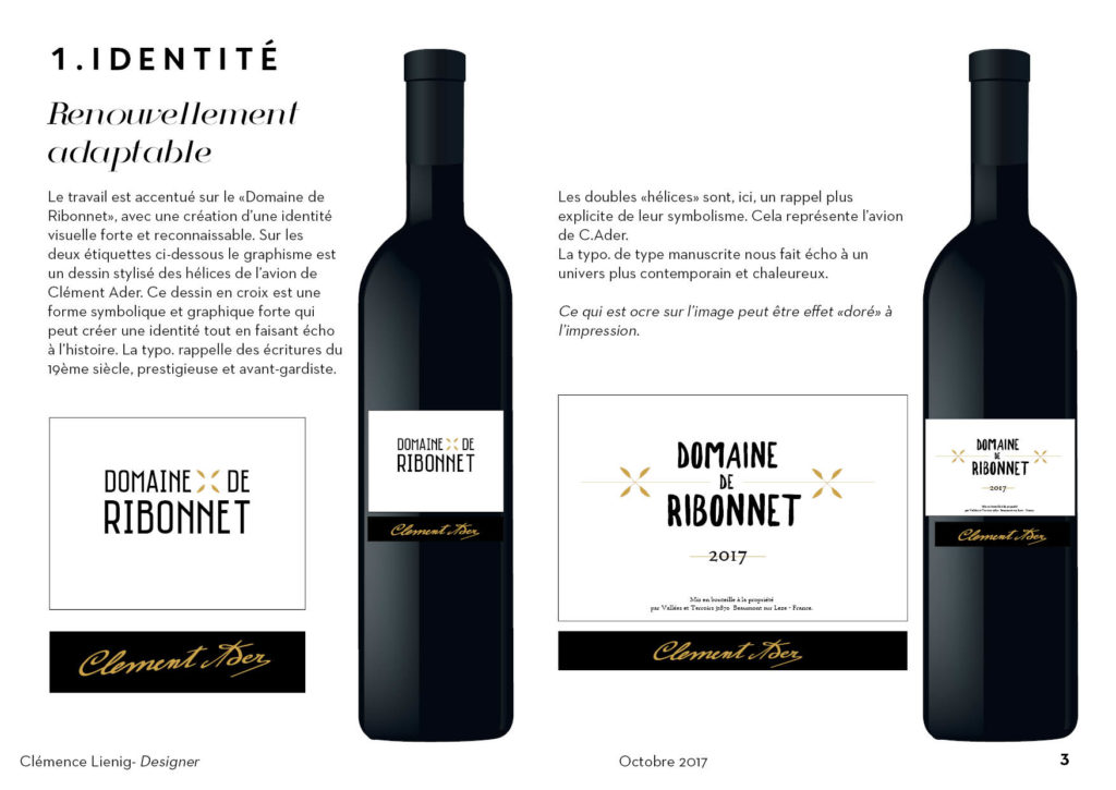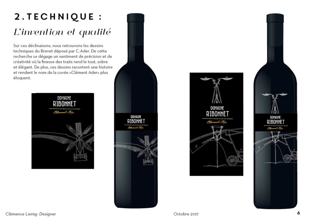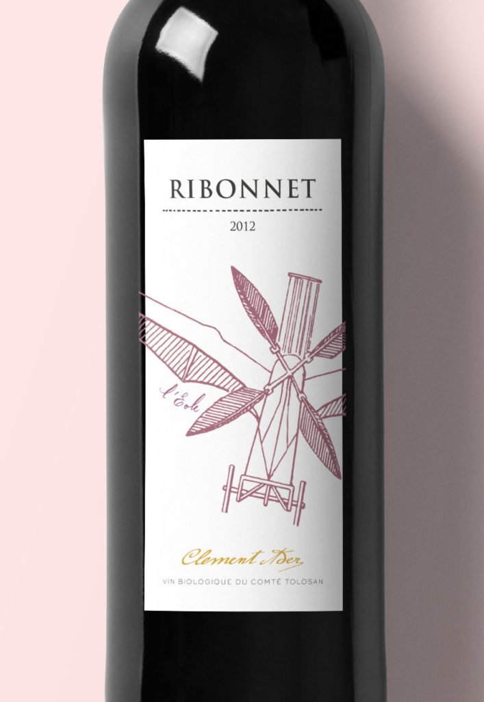 Clément Ader inventeur de renom fut propriétaire du Domaine viticole "Ribonnet" - Beaumont-sur-lèze . En son hommage, le projet d'étiquette pour cette cuvée s'est inspiré des dessins des Brevets déposés par Mr Ader. C’est une recherche très graphique mettant l’accent sur le travail de l'inventeur. La qualité et le prestige sont mis en valeur. Il se dégage un sentiment de précision et de créativité où la finesse des traits rend le tout, sobre et élégant. De plus, ces dessins racontent une histoire et rendent le nom de la cuvée «Clément Ader» plus éloquant.