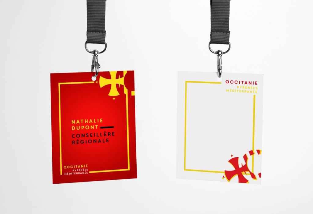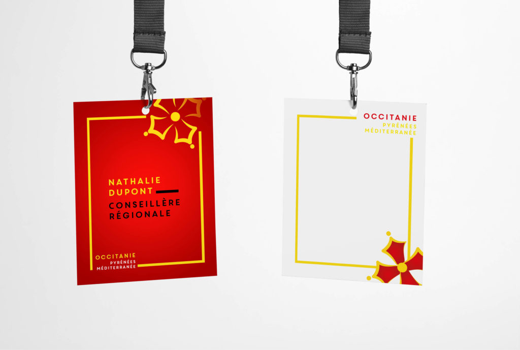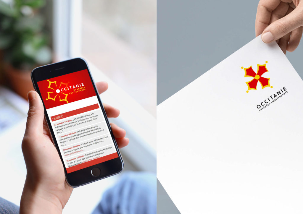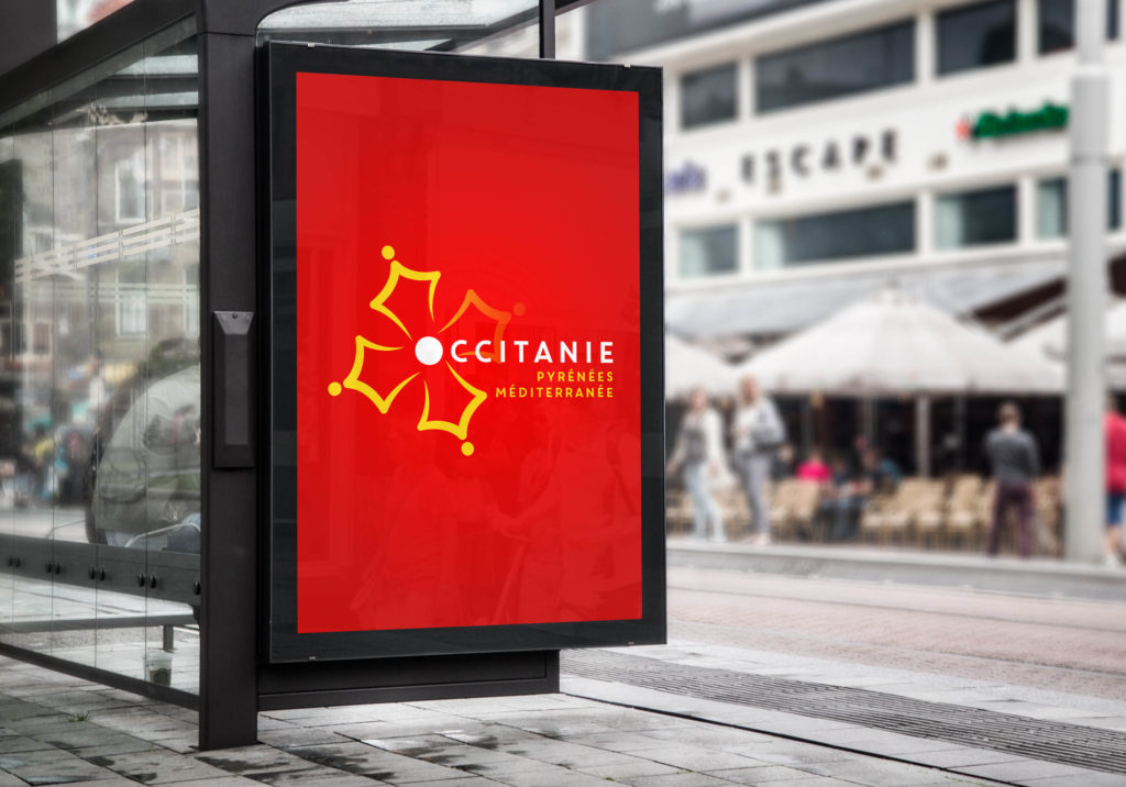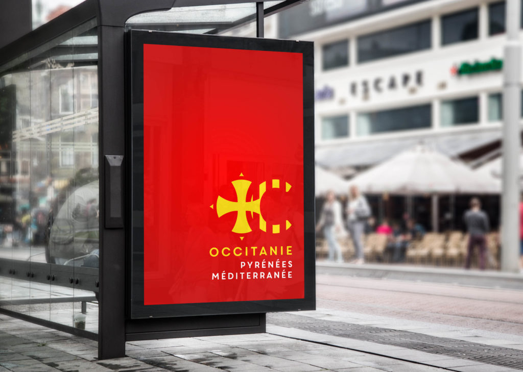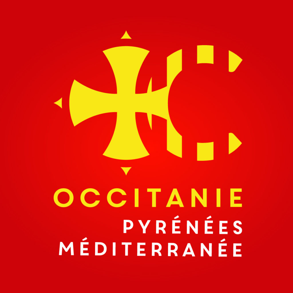 Le premier logo reprend principalement la croix occitane. Cette croix est travaillée, stylisée pour représenter la croissance et l’avenir de cette région unifiée. Le tout, tourne autour d’un cercle représentant le carrefour des civilisations, ce brassage culturel qui a fait sa richesse d’hier et d’aujourd’hui. Ce cercle devient le «O» d’Occitanie créant un lien avec ce nouveau nom qui relie les deux anciennes régions.